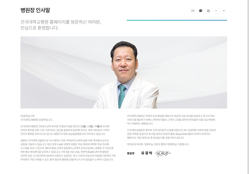 건국대학병원은 환자 안전과 최고의 의료 서비스 제공을 최우선 가치로 삼고 있으며, 지속적인 연구 개발과 의료 기술 혁신을 통해 미래 의료를 선도하고 있습니다. 또한, 지역 사회 봉사 및 사회 공헌 활동에도 적극적으로 참여하며 사회적 책임을 다하는 병원으로 자리매김하고 있습니다.
