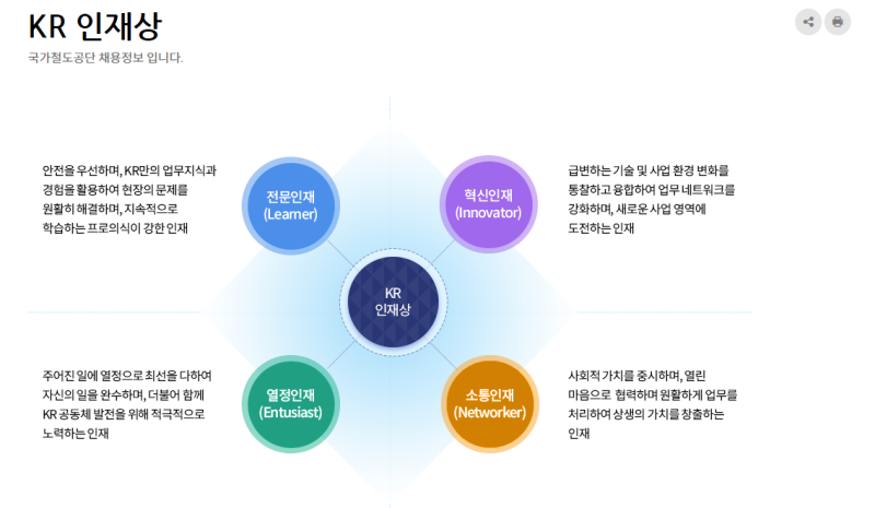 • 인재상: 혁신적 사고로 미래를 창조하는 인재, 협력과 소통으로 가치를 실현하는 인재, 책임감과 전문성으로 최고를 지향하는 인재