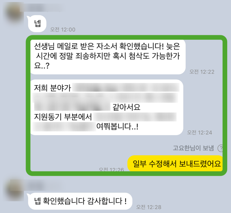 - >> 6. 완성된 **자소서 초안** 제공 및 지원자분과의 꼼꼼한 피드백 반영