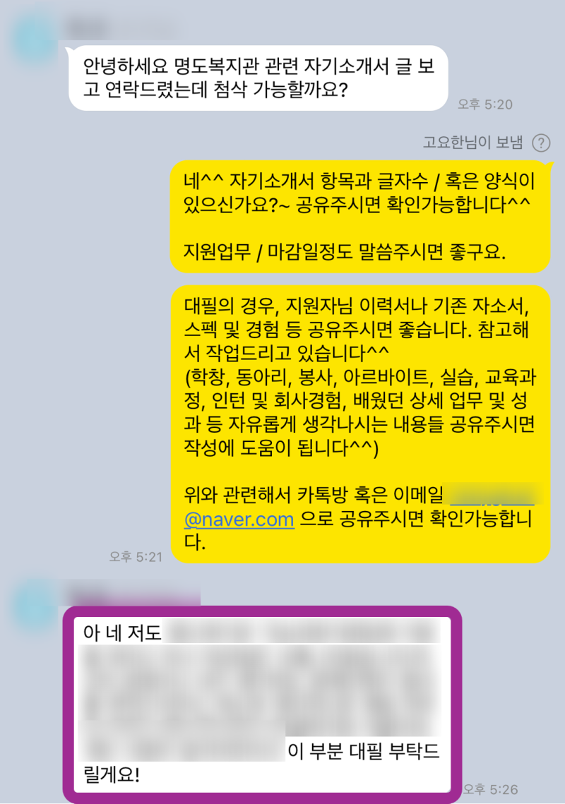 단순히 경험을 나열하는 것을 넘어, 지원자분의 경험과 역량이 명도복지관의 비전과 어떻게 연결되는지 스토리텔링 방식으로 풀어냈습니다. 특히 구체적인 성과와 배운 점을 명확히 제시하여 차별화를 꾀했죠. - 4단계: 최종 검토 및 피드백 🗣️