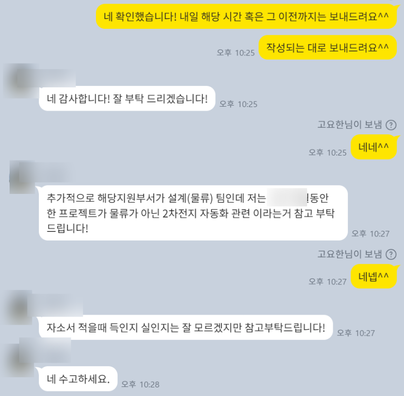 각 단계별로 꼼꼼하게 첨삭을 진행하며, 지원자분의 스토리를 살리면서도 에스에프에이가 원하는 인재상에 부합하도록 자소서를 완성했습니다. 진짜 이건 거의 대필 수준으로 갈아엎었어요! 고객님이 전에 쓰셨던 자소서를 들고 오셨는데, 글자 수도 안 맞고 문장도 그대로 첨삭하면서 거의 다시 짰다고 봐야 해요 제발 다음엔 하루 전에는 와주셔요..! 진짜 그래야 저도 여유 있게 도와드릴 수 있거든요
