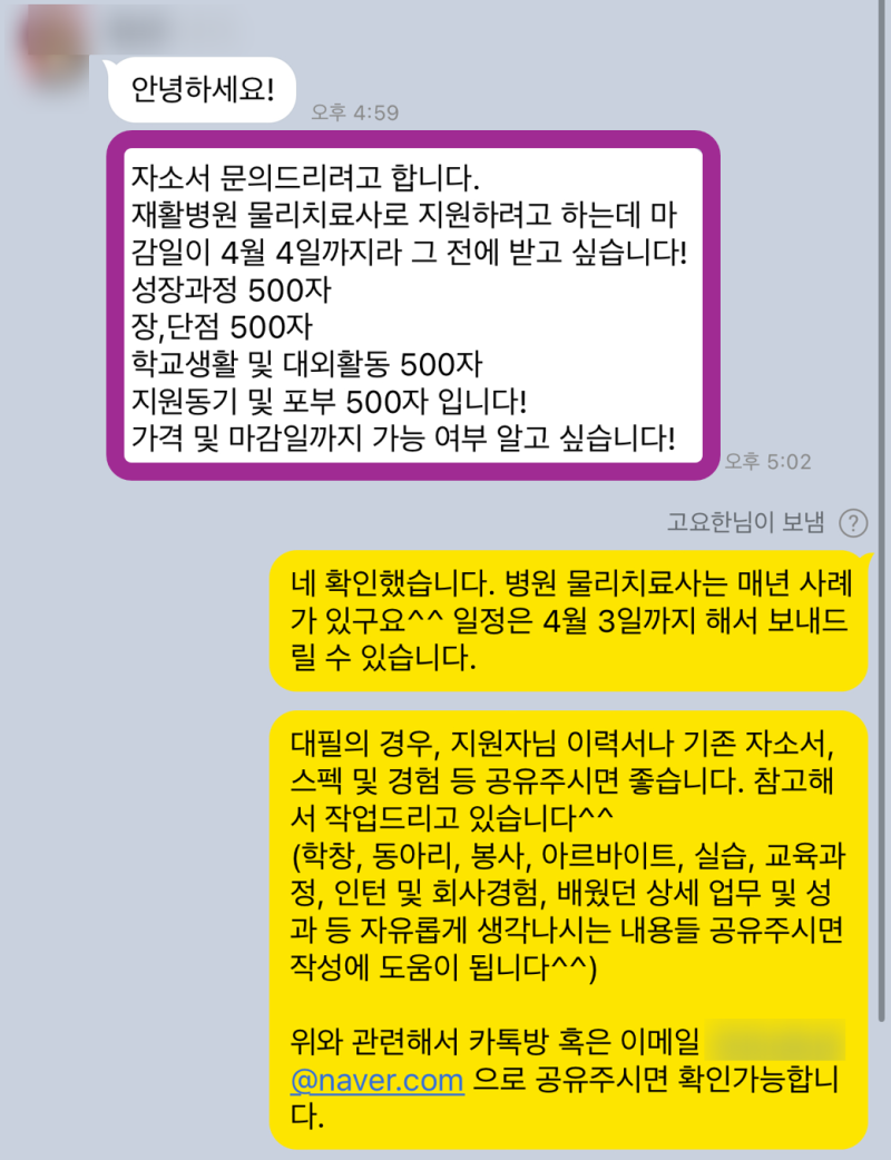 하지만 지원자분은 지원자의 강점 또는 긍정적인 면모, 예: 뛰어난 학습 능력, 긍정적인 태도, 꼼꼼함, 문제 해결 능력 등을 가지고 계셨고, 저는 그 잠재력을 믿었습니다. 우리는 함께 지원자분이 자신의 경험을 어떻게 ‘직무 역량’과 ‘기업의 가치’에 연결시킬 수 있을지에 대한 깊이 있는 대화를 나누었습니다. 몇 날 며칠, 지원자분은 자신도 몰랐던 새로운 강점과 경험들을 끄집어내 주셨고, 저는 그 이야기들을 회사명이(가) 찾는 인재상과 직무 요구사항에 맞춰 구체적인 스토리텔링으로 재구성하는 작업을 진행했습니다. 마치 숨겨진 보석을 발굴해내는 작업과 같았죠. 정말이지, 이건 거의 대필 수준으로 갈아엎었다고 봐야 해요! 고객님이 전에 쓰셨던 자소서를 들고 오셨는데, 글자 수도 안 맞고 문장도 그대로 첨삭하면서 거의 다시 짰다고 봐야 해요 제발 다음엔 하루 전에는 와주셔요..! 진짜 그래야 저도 여유 있게 도와드릴 수 있거든요