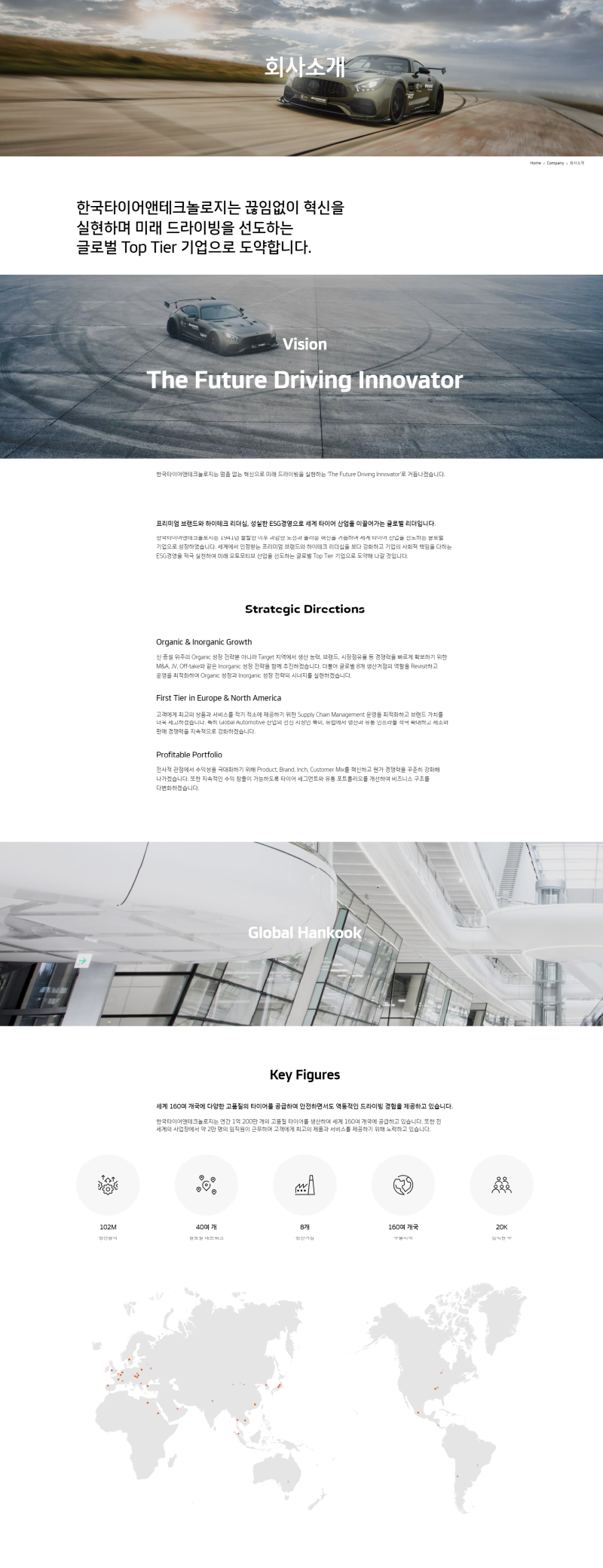 • 주요 사업: 승용차/SUV/트럭/버스용 타이어 제조 및 판매, 레이싱 타이어, UHP(초고성능) 타이어, 그리고 최근에는 모빌리티 서비스 솔루션으로 사업 영역을 확장 중