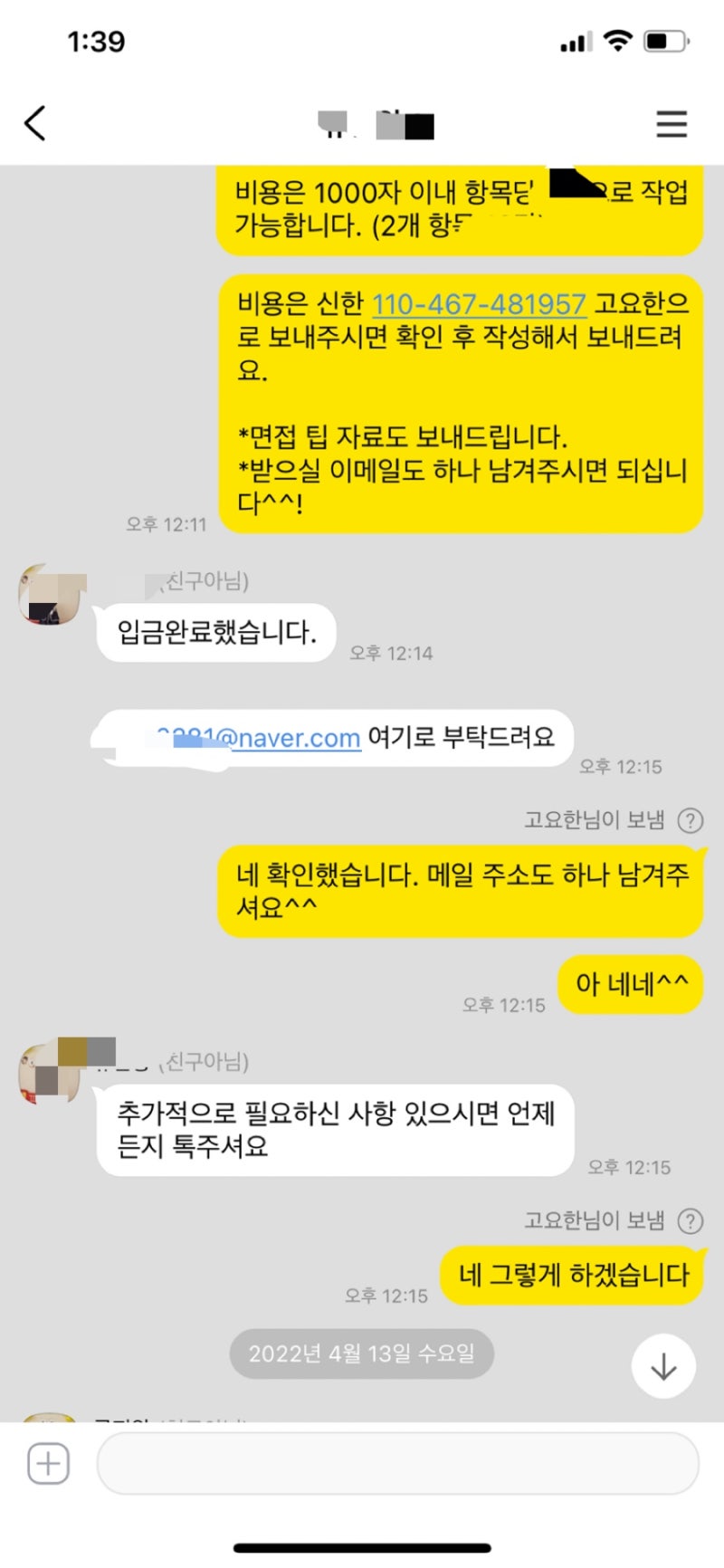 매년 2000명 이상, 수백 건의 합격 사례를 보유한 제가 여러분의 취업 성공을 위한 든든한 조력자가 되어드리겠습니다! 🤝 자기소개서 첨삭 및 대행, 학업계획서, 경력기술서 및 직무수행계획서, 면접 컨설팅까지, 취업 준비의 모든 과정을 함께하고 있어요. 꼼꼼한 채용공고 및 자소서 문항 분석을 통해 자기소개서 작성하는 방법을 알려드리고, 여러분의 서류 합격을 현실로 만들어 드릴게요! 🚀 언제든 편하게 문의해주세요! 😊