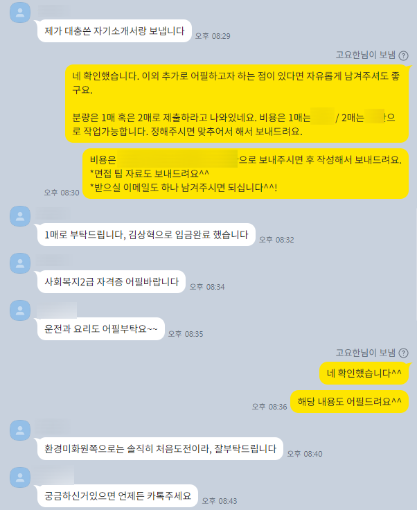 - >> 최종본 전달 및 피드백: 완성된 자기소개서를 전달해 드리고, 궁금한 점은 충분히 피드백 드립니다.