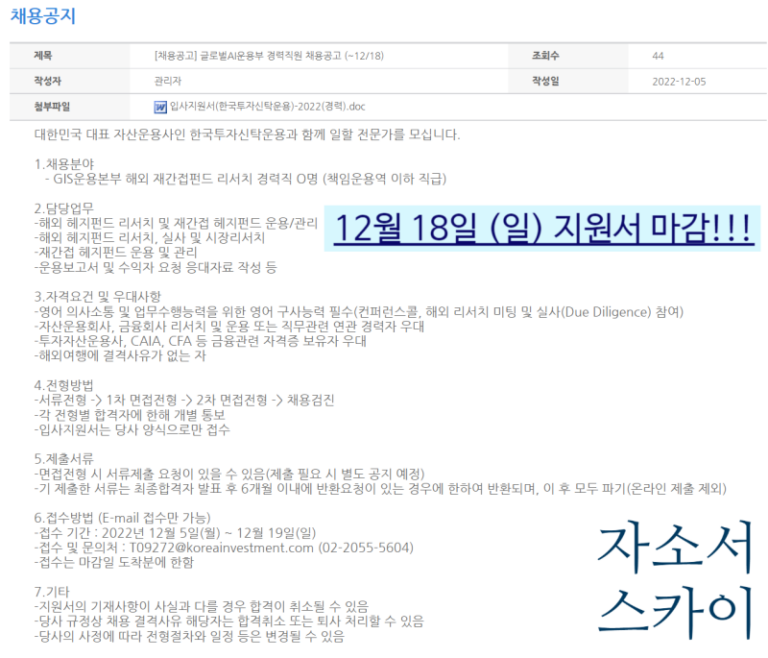 한국투자신탁 채용공고, 자소서 문항 분석, 합격후기