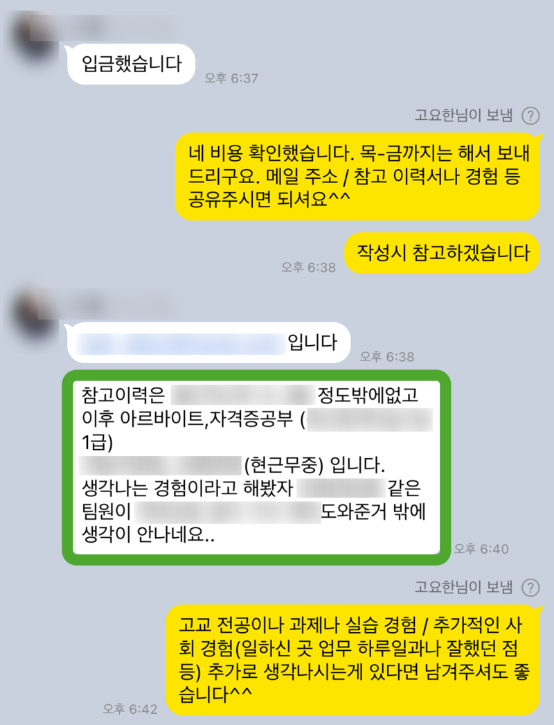 - >> 현재 상황 및 경력 등 상세 정보 공유: 이력서 초안, 경험 내용, 가치관 등 지원자님의 스토리를 들려주세요. 제가 매년 수많은 분들의 자소서 쓰는 법과 자기소개서 작성하는 방법을 코칭하면서 얻은 노하우를 바탕으로, 최대한 많은 정보를 이끌어낼 거예요! 📝