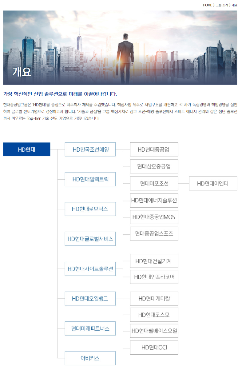 - 주요 사업: 조선해양(현대중공업, 현대미포조선, 현대삼호중공업), 건설기계(HD현대인프라코어, HD현대건설기계), 에너지(HD현대오일뱅크), 전력기기(HD현대일렉트릭), 로봇(HD현대사이트솔루션) 등 미래를 선도할 다양한 사업 포트폴리오를 구축하고 있습니다.